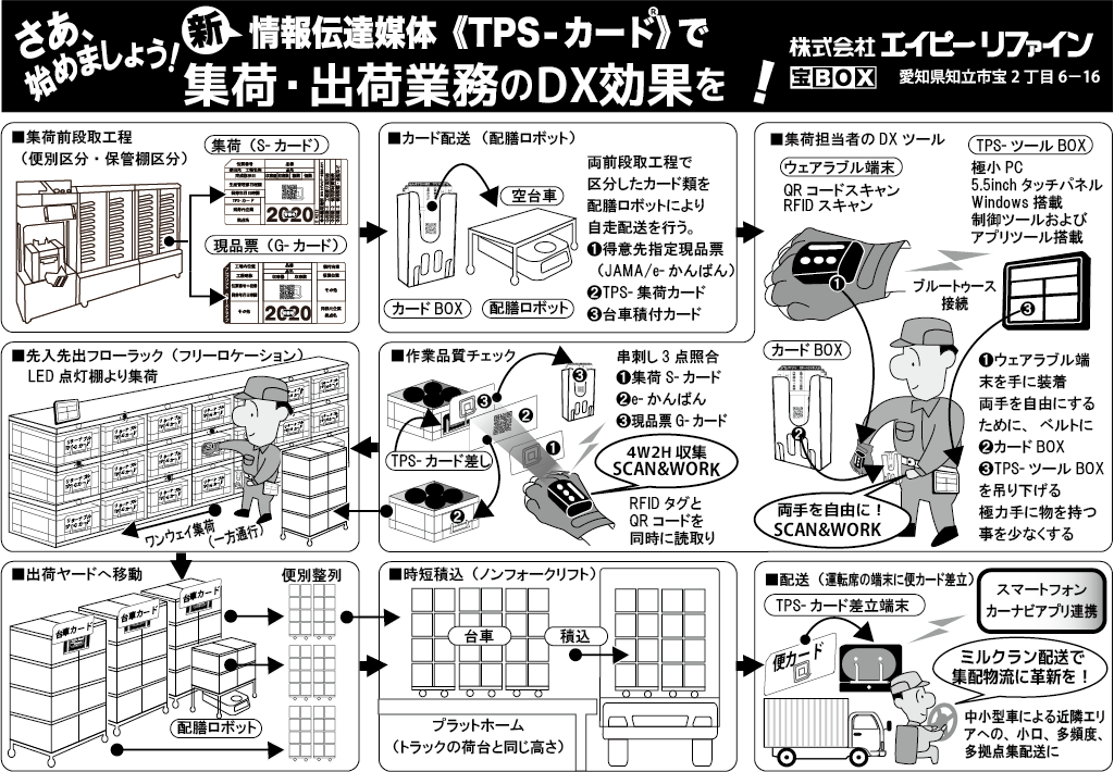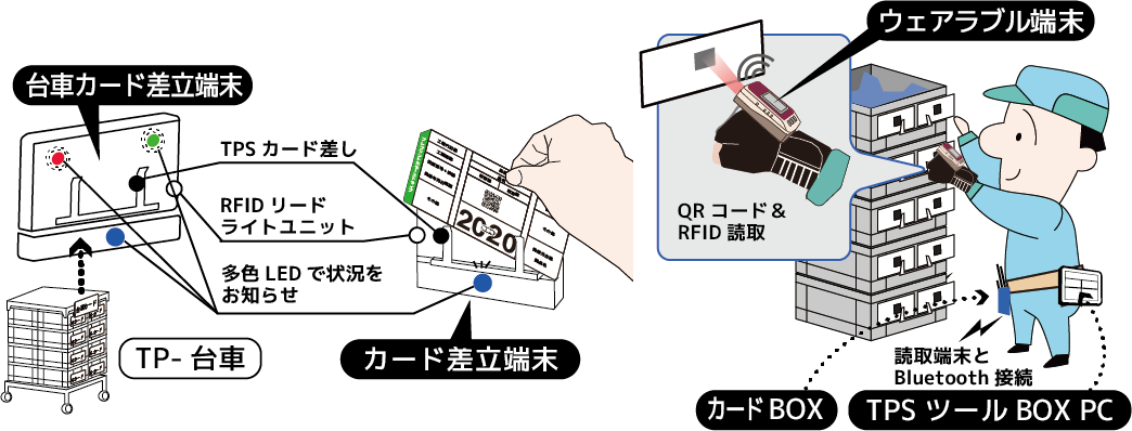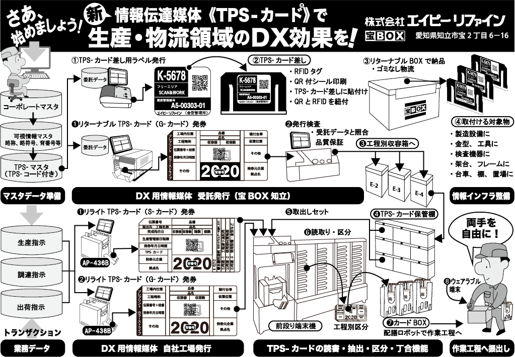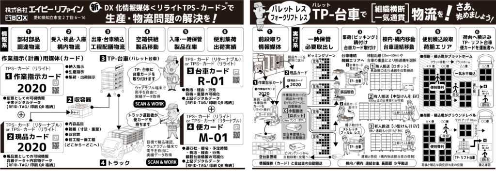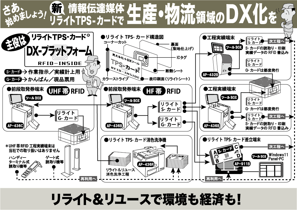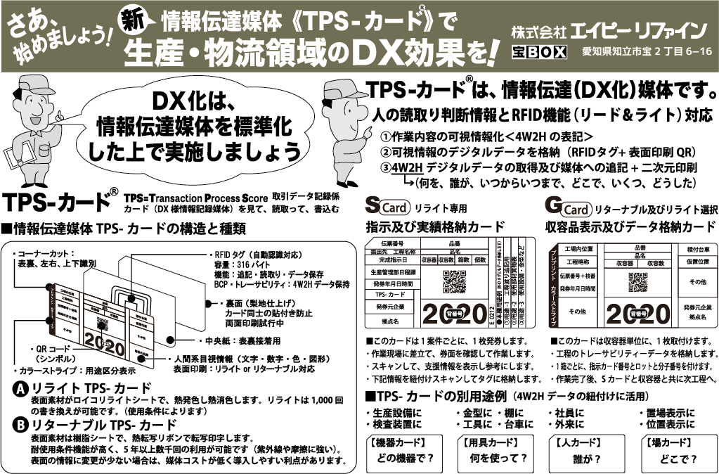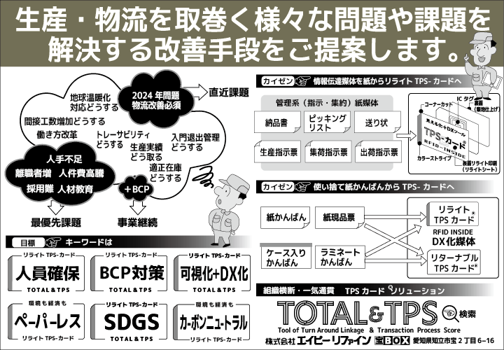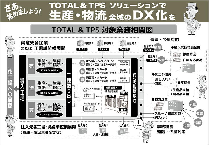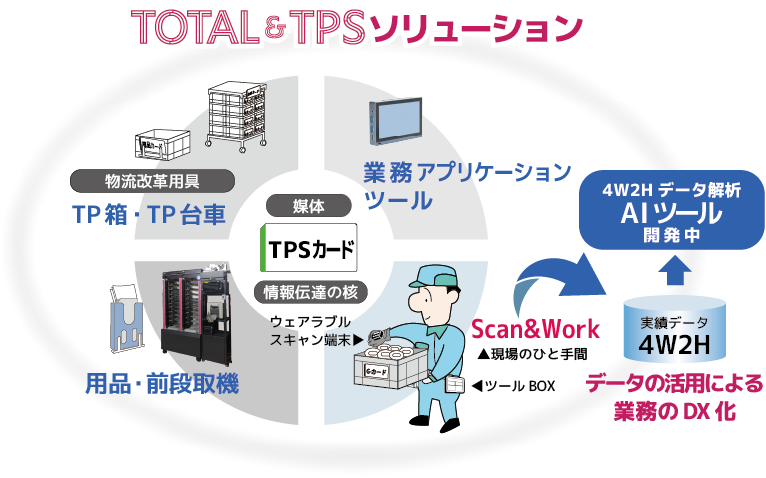 TOTAL(Tool of Turn Around Linkage)&TPS(Transaction Process Scorer)は、「TPSカード」を用いて業務の実績データである「4W2H」をリアルタイムで収集し、モノの動きを情報化して生産と物流領域をDX化するソリューションです。