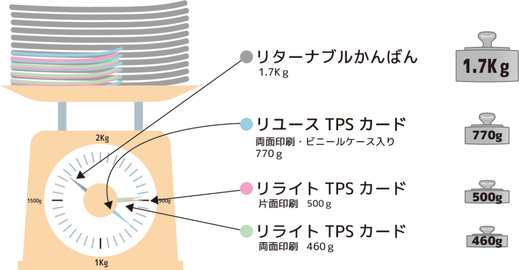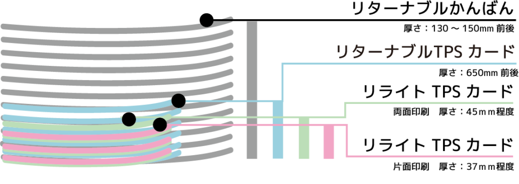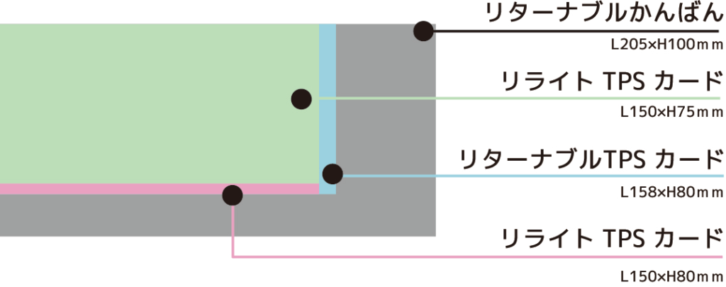 | リターナブル TPSカードⓇ | 両面印刷・ビニールケース入りで繰り返し利用 ・RFID入り・コーナーカット・ラウンドカット ![]() | 外寸: L158×H80mm 100枚で 重さ:770g 厚さ:63mm程度 | ・150×145mmの用紙に印刷し真ん中で2つ折りしてケースに入れる ・表示情報変更があった場合は中身を交換 ・サイズは小さいが、印刷可能(表示)面積は広い ・カード抽出・区分機利用可能 |