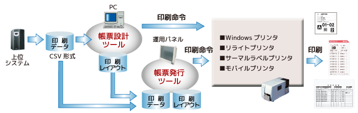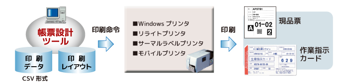 現品票、荷札ラベル、作業指示書、各種伝票などのレイアウト作成に適しており、帳票イメージを各種プリンタへ出力することができます。印刷データは、業務システムなどで作成されたCSVデータも取り込み可能です。