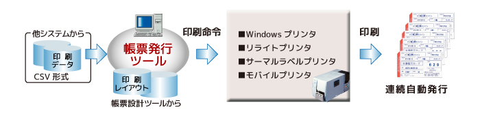 帳票発行ツールは印刷データファイルの内容をレイアウトに差し込み、 印刷するイメージのデータを作成し、自動連続印刷又は選択印刷により帳票を発行します。