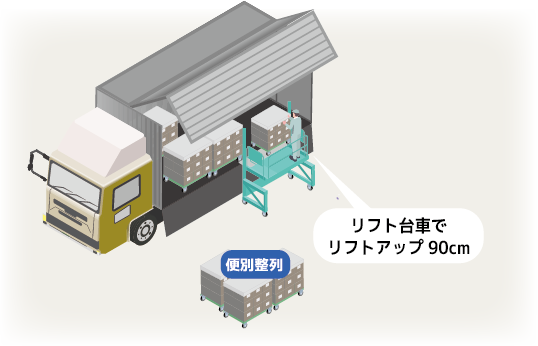 トラックへの積み込み場が地面と同じ高さの場合は、TP-リフト台車を使い積み込みします。