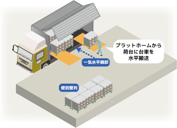 トラックへの積み込み場がプラットホームになっている場合は荷台への渡し板を使って水平移動して積み込みします。